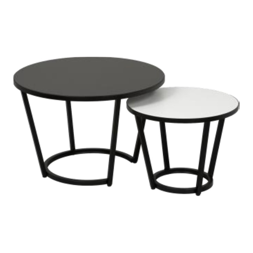 Les photos ci-contre présentent deux configurations gigognes, 1 avec les tables ⌀50 et ⌀70, plateaux chêne, l'autre avec la table ⌀50 en plateau blanc, et la table ⌀70 en plateau noir.